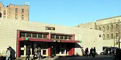 A third entrance is at the center of the station on the east side of East 18th Street, between Caton and Church Avenues.[18] This entrance contains the ADA-accessible elevators to both platforms.[19] This entrance replaces a smaller exit that led only from the southbound platform. The exit had a small structure made from brick and stucco; it was added in the early 1960s, but was closed by the early 1980s.[20]