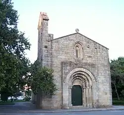 The principal facade (oriented to the west) is marked by a single portico with three semi-circular arches, decorated with animals and birds, supported on rounded-columns.[1] This triumphal arch entrance-way, is constructed over two limestone capitals and has a cubic appearance, extending from the main facade of the church.[1] Many of the decorations are thought to be reused elements from an older building, likely from a Suebi-Visigothic construction (and has been the centre of historical speculation since the 17th century).[1][2] The triumphal arch is surmounted by a Romanesque slit-window, flanked by rounded capitals, and finally surmounted by a Neolithic cross on its apex. Within the cantilever tympanum there is an inscription dating to 1767.[1]