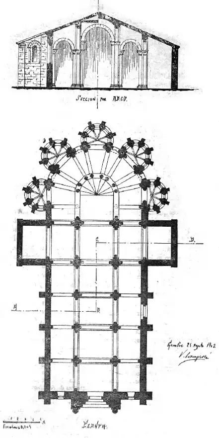 It shows clear influences from the cathedral of Santiago de Compostela in its crown with five radial chapels, which makes it related, despite its size, to the great pilgrimage churches. The radial chapels open to the crown by ogival arches, supported by semi-columns attached to the walls, and are covered with ribbed vaults.