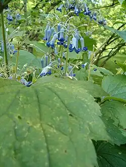 Growing to 1 m (3.3 ft) tall by up to 50 cm (20 in) broad, it is a deciduous sub-shrub with broad downy leaves in groups of three, and delicate clusters of elongated tubular blue flowers in late spring and summer. Mature blooms recurve (bend backwards) into a trumpet shape. Repeat flowering sometimes occurs in autumn.[3]