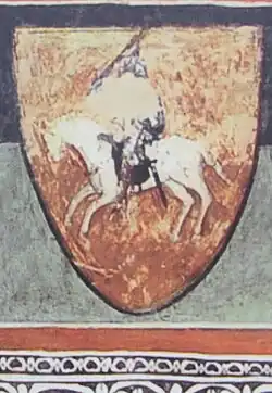 Coat of arms of Vytautas the Great, which features the standing knight of Kęstutaičiai and Vytis (Waykimas), used during the Council of Constance. Painted by Ulrich of Richenthal, 15th century. -