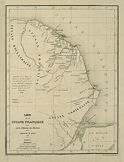 - ^ a b Cap du Nord defines the boundary between French and Portuguese Guiana under the Treaty of Utrecht. In the 1857 map shown here the cape is just north of the mouth of the Araguari River. The Portuguese considered that Cap du Nord was just south of the Oyapock river, shown on this map as shown as Cap d'Orange.