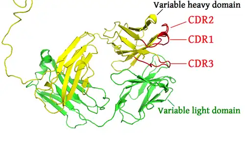 - ^ a b c Gabrielli E, Pericolini E, Cenci E, Ortelli F, Magliani W, Ciociola T, et al. (December 2009). "Antibody complementarity-determining regions (CDRs): a bridge between adaptive and innate immunity". PLOS ONE. 4 (12): e8187. Bibcode:2009PLoSO...4.8187G. doi:10.1371/journal.pone.0008187. PMC 2781551. PMID 19997599.