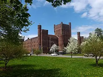Connecticut Street Armory, also known as the 74th Regimental Armory, is a historic National Guard armory building located at Buffalo in Erie County, New York. It is sited at Columbus Park. It is a massive castle-like structure built in 1899 of Medina sandstone. It was designed by architect Isaac G. Perry. It consists of a 3+1⁄2-story administration building with an attached 2-story drill shed all constructed of sandstone, lying on a rusticated battered stone foundation. The building features 4- to 6-story towers surrounding the administration building, and a 6+1⁄2-story square tower at the center entrance. It was the home to the 74th Regiment of the New York National Guard.[2] Prior to its construction, the site was home to a 13.5 million gallon reservoir.[3][4]