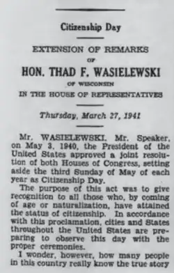 14. ^ Congressional Record, H1941, Appendix to the Congressional Record, p. A1473, Extension of Remarks of Hon. Thad F. Wasielewski of Wisconsin, March 27, 1941, RE: Citizenship Day