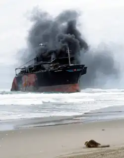 On February 4, 1999, a Japanese ship named the New Carissa ran aground on a beach 2.75 miles (4.3 km) north of the entrance to Coos Bay, drawing international attention to the area. The New Carissa was empty of cargo at the time, heading for the Port of Coos Bay to pick up wood chips. When the captain was told that the weather was too severe for the ship to enter port, he anchored his ship close by. The crew put out only one anchor, and it appears that this was probably on too short a chain to be effective. The subsequent US Coast Guard investigation found several other aspects of the ship's company's handling of the situation to have been poor, leading to the conclusion that human error caused the grounding. Seventy thousand US gallons (260 m3) of #6 crude oil were spilled by the vessel, with a further 165,000 to 255,000 gallons (625 to 965 m3) set alight via explosives and liquid napalm, by the Army Corps of Engineers, over the course of weeks. The explosives, the heat from the burning oil and the beating of the Pacific Ocean on the ship are what eventually caused the New Carissa to break in two.