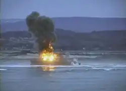 The stern of the ship remained on the beach; the bow was towed out to sea and sunk after multiple attempts. They had to get special tow lines shipped in from overseas and had multiple tug boats pulling it out.