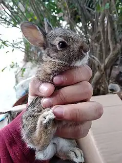 Cottontail rabbits comprise the genus Sylvilagus, which is in the family Leporidae. They are found in the Americas.[1] Most Sylvilagus species have stub tails with white undersides that show when they retreat, giving them their characteristic name, but this feature is not present in all Sylvilagus species, nor is it unique to the genus. Their fur ranges from brown to gray and changes throughout the year, depending on the season.[2]