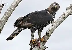 The crowned eagle, also known as the African crowned eagle or the crowned hawk-eagle (Stephanoaetus coronatus), is a large bird of prey found in sub-Saharan Africa; in Southern Africa, it is restricted to more easterly areas.[2] Its preferred habitats are principally riparian woodlands and various forests.[2] The crowned eagle is the only extant member of the genus Stephanoaetus. A second species, the Malagasy crowned eagle (Stephanoaetus mahery), went extinct after early humans settled on Madagascar.[3]