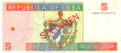 In the year 2004, the Central Bank of Cuba issued its first series of convertible peso bills with face values of 5 and 10 convertible pesos. The printing is flat, and the front and back design is generally similar to the 1994 series issued by the National Bank of Cuba, showing the legend "Central Bank of Cuba" and its logo. The security elements present are the localized watermark with the effigy of José Martí and the security thread with the text "PATRIA O MUERTE - VENCEREMOS"