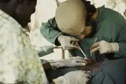 A Cuban surgeon with scrub cap performing an open air operation in Guinea-Bissau for the PAIGC liberation movement, 1974