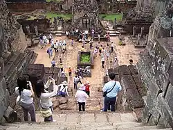 Tourists taking pictures at the khmer Pre Rup temple ruins, an example of cultural tourism.