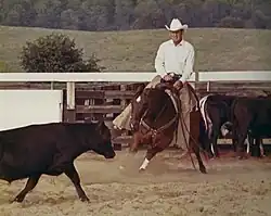 A cutting horse is said to possess an innate ability to anticipate or read a cow's intended moves; an ability commonly referred to as having cow sense or cow smarts.[2] Competitive cutting horses are well-trained and conditioned athletes with skills honed to constrain the movement of a cow and prevent it from returning to the herd. Such horses are able to stop and turn instantaneously, in sync with a cow's every move. The harder a cow tries to get back the herd, the more instinct, skill and athleticism are required of the horse to stay head to head with the cow, and the higher the competition score. A common analogy is a basketball point guard holding off a defender.[3] American Quarter Horses and other horse breeds with Quarter Horse ancestry, such as American Paint Horses are the most popular choices for the sport, although other breeds with stock horse type are also used, particularly in breed-specific competition.