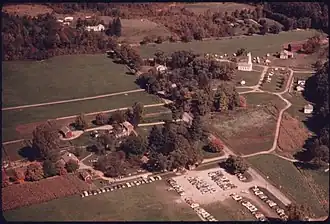 The valley began providing recreation for urban dwellers in the 1870s when people came from nearby cities for carriage rides or leisure boat trips along the canal. In 1880, the Valley Railway became another way to escape urban industrial life. Actual park development began in the 1910s and 1920s with the establishment of Cleveland and Akron metropolitan park districts. In 1929, the estate of Cleveland businessman Hayward Kendall donated 430 acres (0.7 sq mi; 1.7 km2) around the Ritchie Ledges[26] and a trust fund to the state of Ohio. Kendall's will stipulated that the "property should be perpetually used for park purposes". The area was called Virginia Kendall Park, in honor of his mother. In the 1930s, the Civilian Conservation Corps built much of the park's infrastructure including the Happy Days Lodge and the shelters at Octagon, the Ledges, and Kendall Lake.[27] The Happy Days Lodge, near Peninsula, was constructed from 1938 to 1939 as a camp for urban children.[28] The lodge is presently used only as a special events site.[29]