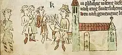The existence of the czupryna amongst the Polabian Slav territories is clearly attested by many archaeological discoveries. By way of example, one may adduce the following: a small bronze statue from Schwedt/Oder (X-11th century),[13][14] Altfriesack Götze, a wooden statue from Altfriesack (6th-7th century),[15] a sitting statue from Gatschow near Demmin (XI-12th century),[16] and a small sculpture from Merserburg near Leipzig (10th century).[17] All the figures have short hair and halfshaven heads. There are also a metal fitting from the museum in Oldburg and a wooden statue from Wolin (10th century). Because of corrosion, it is difficult to say if the heads are shaven, but the hair is surely short.[18][19] The clearest proof are the Sachsenspiegel illustrations - all Wends in the illustrations (in contrast with the long-haired Saxons) have a short haircut, shaved at ear-height.