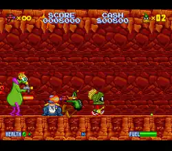 Dodgers has infinite ammo for his starting gun and more guns with limited ammo can be found or bought throughout the game with the game's fictitious currency (which is depicted by the dollar sign). There are five types of guns: the regular gun, the three-shot gun, the electric gun, the bomb gun and the antimatter gun. Dodgers also has a jet pack so he can fly around to avoid danger on the ground and reach new locations, a shield to block incoming projectiles and a special attack called Nutty, which makes Duck Dodgers whirl around and destroy every enemy on the screen.[4] However, Duck Dodgers has a tendency to bounce backwards whenever he fires a shot from any of his weapons.