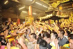 In modern times, temples that Mazu doesn't visit will sometimes send people to surround the litter and forcefully ask them to make a detour to their temple. In most cases, the litter bearers concede to these requests in order to avoid conflicts. However, violent brawls do occur if the two sides do not come to an agreement. Therefore, the procession is often accompanied by a large police presence to discourage litter stealing.[18][19]