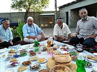 A dastarkhān (Persian / Urdu: دسترخوان, Tajik: дастархон, Bashkir: дастархан, romanized: dastarxan, Kyrgyz: дасторкон, Hindi: दस्तरख़्वान, Kazakh: дастарқан, Bengali: দস্তরখান, Uzbek: dasturxon, Nepali: दस्तरखान) or dastarkhwān is the name used across Central Asia and South Asia to refer to the traditional dining space where food is eaten.[1][2][3] The term is a word of Persian origin meaning the tablecloth which is spread on the ground, floor, or table as a sanitary surface for food.[2][3]