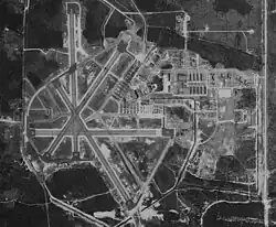 In the late 1930s, four 4000 feet by 150 feet (46 m) runways were built, all paved, allowing flights on Douglas DC-2s and DC-3s. The terminal was on the south side of the airport.[3] For a short while in 1940, a zookeeper was hired to maintain the airport.