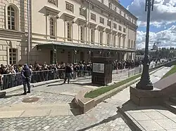 Gorbachev's body lay in state on 3 September within the Pillar Hall of the House of the Unions in Moscow, which has historically been used to hold state funeral services for high-ranking officials and leaders, including for Joseph Stalin after his death in 1953.[4][5] Notably, unlike his successor, Boris Yeltsin, Gorbachev would not be granted a state funeral. However, Kremlin spokesperson Dmitry Peskov did announce that Gorbachev would be given "elements of a state funeral", such as a guard of honor and partial government organization.[6] It was also announced that Russian president Vladimir Putin would not attend Gorbachev's funeral, a move that attracted media attention.[7] A statement from the Kremlin alleged this was due to his busy schedule.[8][9]