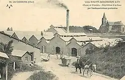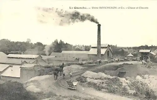 Old postcards and the stationery used by Daumy, Boucheron & Cie around 1910 show all the means of transport they used. The lime was taken by the 600 mm (1 ft 11+58 in) gauge Decauville railway from the quarries below the church, to the limekilns, slaking ponds and grinding mills, and finally to the shipping points for the finished products on the railway and the Berry Canal. However, contrary to what is shown in the artistic impression, the factory was located about 500 metres (550 yd) away from the Berry Canal on the other side of the town centre of La Guerche.[3]