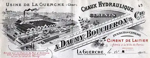 One of the founders of the company has originally been producing hydraulic lime, a building material that hardens both in the air and under water. His factory, Daumy Ainé et Cie, was initially, around 1869, located in Beffes near Jouet, 19 kilometres (12 mi) to the north.[2]