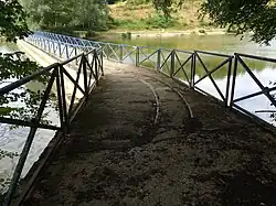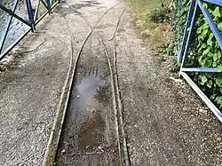 The Decauville railway with a gauge of 600 mm (1 ft 11+58 in) ran from the quarries to the forges and offices at the railway station, near which other metalworking factories and electric motor works were opened up via the narrow-gauge railway around 1932.[6][7] The Decauville railway was operated with steam locomotives and numerous tipping lorries. Remains of the tracks are still preserved on the embankment that divides the lake into two parts. In the newly created park on Rue de la Gare, the park paths follow the route of the former light railway.[8]