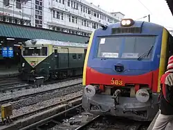 EMU (green and yellow) and MEMU (blue, red and yellow) train of Delhi suburban railway.