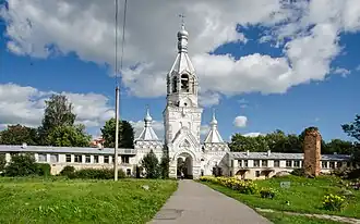 The northern house is now long yellow 2-floored building, standing on the opposite side of the monastery from the southern house. Historically, these were 2 separate buildings, although: the first one was built in 1884, the second one – in 1895; both buildings had a first floor of bricks, and second floor of wood.[68] Nevertheless, they were gathered into a sole building during the reconstruction in 1981, and the second floor was replaced with one of brick in the same year.[69] One more building with cells is made of wood, constructed in the early 20th century, and stands opposite the northern side of the perimeter. The joint building is now a museum, and the building of wood is closed to visitors.[70] The place called Black Court was located right behind the northern house: it gathered the buildings like a stable, a bathhouse, a laundry, some shades for firewoods and hay, and a garden. This territory is out of monastery's complex, and these outbuildings are not preserved.