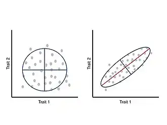 Representation of the relationship between two traits. Left: No trait covariation. Each trait changes independently of the other. Right: Trait covariation causes a positive correlation between traits where increase in one trait is correlated with an increase in the other trait (covariation can also produce negative correlation). The red line within the ellipse represents the main eigenvector of the variance-covariance matrix.