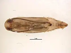 This small moth is colored gray and brown. It can potentially identified by a cream-colored band that may be present in the shape of a diamond on its back.[1] The diamondback moth has a wingspan of about 15 mm and a body length of 6 mm. The forewings are narrow, brownish gray and lighter along the anterior margin, with fine, dark speckles. A creamy-colored stripe with a wavy edge on the posterior margin[2] is sometimes constricted to form one or more light-colored diamond shapes, which is the basis for the common name of this moth. The hindwings are narrow, pointed toward the apex, and light gray, with a wide fringe. The tips of the wings can be seen to turn upward slightly when viewed from the side. The antennae are pronounced.[1]
