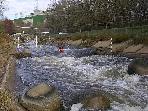 Streamflow through the course is 200 cu ft/s (5.7 m3/s) to 600 cu ft/s (17 m3/s), depending on the operation of the plant's three coal-fired generators and their six cooling water pumps. In the summer months, when water temperature in the channel exceeds 100 °F (38 °C), the course is closed for health reasons.[3] It is also closed when the Potomac River rises above 5 feet (1.5 m) on the Little Falls gauge[4] 20,000 cu ft/s (570 m3/s), flooding the lower section of the course.[3]
