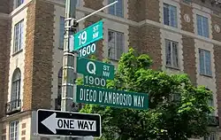 In 2009, D'Ambrosio was awarded the Order of the Star of Italian Solidarity at the Italian Embassy, in recognition of his promotion of his Italian heritage.[4] On April 23, 2010, D.C. Mayor Adrian Fenty joined other local government officials in designating the 1900 block of Q Street, N.W., as Diego D'Ambrosio Way (an alternative street name). The Diego D'Ambrosio Way Designation Act of 2010 "officially recognizes Diego's contributions to District of Columbia residents and the city's business community."[5]