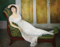 From there he went to Paris, a destination for young European and American artists and writers, who settled in inexpensive flats in Montparnasse. His circle frequented La Ruche, where his Italian friend Amedeo Modigliani painted his portrait in 1914.[12] His circle of close friends included Ilya Ehrenburg, Chaïm Soutine, Modigliani and his wife Jeanne Hébuterne, Max Jacob, gallery owner Léopold Zborowski, and Moise Kisling. Rivera's former lover Marie Vorobieff-Stebelska (Marevna) honored the circle in her painting Homage to Friends from Montparnasse (1962).[13]