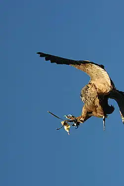 Additional large raptors, i.e. those that can average 1,000 g (2.2 lb) or more in body mass, taken as prey include the 1,080 g (2.38 lb) red kites (Milvus milvus) from the genus Milvus , and the rough-legged buzzards (Buteo lagopus) and saker falcons (Falco cherrug), in both of which females average more than 1,000 g (2.2 lb).[2][61][154][155][156][157] The taking of rough-legged buzzards and snowy owls must be confined to full-grown victims, since they nest further north than Eurasian eagle-owls.[2] Though uncommon, eagle-owls can prey on even larger raptors, such as osprey (Pandion haliaetus), lesser spotted eagle (Clanga pomarina), short-toed eagles (Circaetus gallicus), and Egyptian vulture (Neophron percnopterus).[17][128][119] Even fledgling of Bonelli's eagles (Aquila fasciata) and nestling of white-tailed eagles (Haliaeetus albicilla) are known to be preyed upon.[158] Additionally Eurasian eagle-owls also hunt the smallest raptors available, including those such as lesser kestrels (Falco naumanni) and Japanese sparrowhawks (Accipiter gularis) that weigh less than 150 g (5.3 oz).[89]
