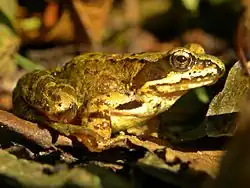 Little evidence has been found of tawny owl predation on reptiles. Despite their scarcity about a dozen species are known to be hunted by this predator, including a couple species of snake and several lizard species.[1][34][127][88][128] They are more or less taken incidentally, constituting always less than 2% of the foods in known European studies.[34][129][130] An exceptional case was in Sahel, Algeria, where the Moorish gecko (Tarentola mauritanica) was the leading prey species at 16.75% of 2472 prey items.[75] Amphibians are generally much more prominent in the tawny owl's diet, almost exclusively frogs.[1] Nearly 20 species of amphibian are known to be taken, which includes two species of newt outside of the more typical frogs and toads.[1][34][75][131][132] Key to predation on frogs is the composition of the habitat, with frogs and toads being apparently much more accessible in remote and conserved areas rather than developed lands.[1] In different areas of Poland, the Rana genus of frogs led the prey composition such as in Białowieża Forest, where they made up 21.1% of the foods, in Wigry National Park where they constituted 17.4% of the diet and in the northeasterly section of the country where they made up 23.4% of 2046 vertebrate prey items.[123][133][134] Elsewhere frogs and amphibians are regular but secondary foods. Of 3194 prey items in Finland, amphibians (probably all frogs) were secondary to rodents, and could account for from 16.6% in good vole years to 19.5%, the leading prey type by number, in bad vole years, with an average 17.5%. from all years.[135] In Lithuania, frogs constituted 14.5% of 1125 prey items, with the common frog (Rana temporaria) in particular accounting for 11.2%.[136] In Sahel, Algeria, the Mediterranean painted frog (Discoglossus pictus) was a fairly important prey resource, at 9.22% by number and 10.5% by biomass.[75] The average size of frogs taken can be fairly variable, from an estimated 7 to 39.8 g (0.25 to 1.40 oz), as claimed for central Italy and England, respectively.[35][53] There are now several instances known of tawny owls preying on fish, though they are not known to be a significant food source anywhere in the distribution.[1][34] About eight species of wild fish are known to have been captured, including probably young or infirm specimens of large fish such as northern pike (Esox lucius) and brown trout (Salmo trutta), with at least some instances of tawny owls also catching ornamental goldfish (Carassius auratus) as well.[1][34][91][137]