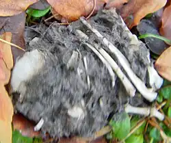 Upon capture, small prey like shrews and rodents are often swallowed whole, while others may be torn into pieces. Often prey is dismembered in order to more easily ingest it whole, i.e. decapitating mice, removing the legs from frogs while birds like sparrows are also regularly decapitated (with the head often eaten separately) and nearly all avian prey is plucked before being consumed.[7][28][29][30] One tawny owl was observed to eat a squirrel by leaving the head intact and peeling the skin back from the neck, apparently leaving bones in place while consuming the flesh.[31] Indigestible items, including fur, feathers, bones (which sometimes visibly protrude out of the peller), sometimes intestines and invertebrate carapaces, are regurgitated in large pellets, that can be anywhere in typical size from 20.3 to 67 mm (0.80 to 2.64 in) long with a diameter of 17 to 30 mm (0.67 to 1.18 in). The pellets are typically grey coloured and are found in groups under trees used for roosting or nesting. At least some tawny owl pellets can measure up to 84 mm (3.3 in) long and can include large objects such as an intact 10 cm (3.9 in) bill of a snipe.[7][1][29][32] Undigested material coughed up often reveals different prey than pellets.[7] Estimated daily food requirements for a tawny owl is 73.5 g (2.59 oz), which is proportionately lower (at about 14% of their own body mass) than the estimates for other medium-sized owls in Europe (at 23–26% of their own body mass), therefore tawny owls can appear to live off of relatively little food quite efficiently.[33]