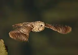 The tawny owl (Strix aluco) is an opportunistic and generalized predator. Peak hunting activity tends to occur largely between dusk to midnight, with owls often following an erratic hunting pattern, perhaps to sites where previous hunts were successful.[1][2] When feeding young, hunting may need to be prolonged into daylight in the early morning.[3][4][5] Based on hand-reared young owls that re-released into the wild, hunting behaviour is quite innate rather than learned.[6] Normally this owl hunts from a perch.[7][8][1] Perching bouts usually last from about 8 to 14 minutes depending largely on habitat.[2] Tawny owl's hunting from a perch or pole can recall a buzzard and the two take similar prey sizes as well. However, high initial speed and maneuvering among trees and bushes with great dexterity may allow it to surprise relatively large prey, more like a goshawk.[7][8] The tawny owl is capable of lifting and carrying off in flight individual prey weighing up to at least 320 g (11 oz).[9] Their middle talon, the most enlarged claw on owls, measures an average of 19.1 mm (0.75 in). While not as large as those of the Ural owl, the talons are extremely sharp, stout and quite decurved. The claws are considered to be visibly more overdeveloped than those of other European mid-sized owls and the footspan including the claws is somewhat larger as well, at an average of about 13.4 cm (5.3 in).[7][10][11] The hunting owl often extends its wings to balance and control prey upon impact.[12] Alternatively, this species may hunt from flight. This occurs from 2 to 3 m (6.6 to 9.8 ft) over the ground, often over open habitats such as bushes, marsh or grassland, forming a quartering or zigzag pattern over the opening. During these flights they cover about 30 to 50 m (98 to 164 ft) before changing direction.[13] Hunting from flight was surprisingly prevalent in a Swedish study of two radio-tagged birds, with 34% of study time spent hunting from flight while 40% of the study time was spent on hunting from a perch.[13] In a similar study in England, less than 1% of time was spent hunting from flight.[2] In a more deliberate variation of hunting from flight, the hunting owl may examine crags and nest boxes or also hover around prey roosts. In the latter type of hunts, the tawny owls may strike branches and/or beat their wings together in front of denser foliage, bushes or conifers in order to disturb and flush prey such as small birds and bats, or may dive directly into said foliage.[7][12][14][15] Hovering has also been recorded in differing circumstances, including one incidence of an owl hunting a small bird that was caught on the wing after a hovering flight.[16][17] Tawny owls have also taken bats on the wing as well (such as ones snatched from near streep lamps when attempting to hunt themselves) and have been seen to hawk large, relatively slow-flying insects such as some beetles and moths in flight.[7][14] Caterpillars may too be taken from trees.[14] Usually these hunting variations are correlated with poor weather hampering the capture of preferred prey.[1][18] Tawny owls eat worms with relative frequency, as they often hear them apparently from below the surface and snatch them up from shallow dirt or below leaf litter. Their worm-hunting style recalls worm hunting techniques by most other birds and they were recorded to eat 0.39 worms per minute during an hour of observation in England and were sometimes seen to feed on worms during daylight.[7][19][20][21] Other hunting from the ground has been observed, often of insects such as beetles, but tawny owls have also been reported to "leap" upon from a ground vantage point in order to capture a vole, quite like foxes often do.[7][22][23] There are now many accounts of tawny owls feeding on carrion from a wide range of sources, including hares, rats, sheep, and trout.[24][25][26][27]