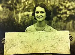Photo of Louise Stef holding the map that fell from the Point d'Interrogation taken on September 30th, 1930 in Portsmouth, NH on her family's farm.