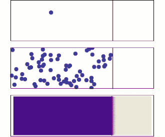 Diffusion from a microscopic and macroscopic point of view. Initially, there are solute molecules on the left side of a barrier (purple line) and none on the right. The barrier is removed, and the solute diffuses to fill the whole container. Top: A single molecule moves around randomly. Middle: With more molecules, there is a clear trend where the solute fills the container more and more uniformly. Bottom: With an enormous number of solute molecules, all randomness is gone: The solute appears to move smoothly and systematically from high-concentration areas to low-concentration areas, following Fick's laws.