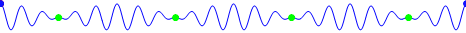 Frequency dispersion of surface gravity waves on deep water. The red square moves with the phase velocity, and the green dots propagate with the group velocity. In this deep-water case, the phase velocity is twice the group velocity. The red square traverses the figure in the time it takes the green dot to traverse half.