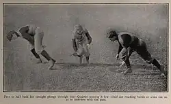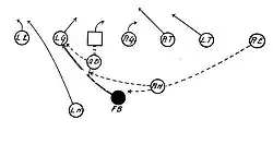 A dive (or plunge or buck, also called a line plunge or line buck)[1] is a type of play in American football in which the ball carrier (usually a fullback or a halfback) attempts to thrust quickly over the line of scrimmage, rushing through the linemen. A dive or buck is distinct from both an end run and an off-tackle run; the gap for the runner can be either between center and guard or between guard and tackle.