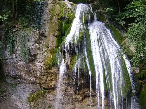 Djur-djur (Armenian: Ջուր-Ջուր — water-water; Crimean Tatar: Curcur — «onomatopoeia to the falling water»)[1] — waterfall is located on the Ulu-Uzen' river in the Crimean Mountains of Crimea. Waterfall height is 16 metres (52 ft). Djur-djur has not dried up ever, even in the dry years. Water from the waterfall falls into a small lake, and then comes into the river channel, which flows into the sea near the village Solnechnogorsk.[2]