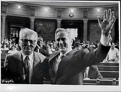 Ćosić was a member of the Serbian Academy of Sciences and Arts, and is considered by many to have been its most influential member. While Ćosić has been credited with writing the Memorandum of the Serbian Academy of Sciences and Arts, which appeared in unfinished fashion in the Serbian public in 1986, he in fact was not responsible for its writing. In 1989 he endorsed the leadership of Slobodan Milošević, and two years later he helped raise Radovan Karadžić to the leadership of the Bosnian Serbs.[12][13] When war broke out in 1991, he supported the Serbian effort.[11] In 1992, Ćosić wrote that Bosnia and Herzegovina was a "historical freak" and he considered that with the disintegration of Yugoslavia, the Serbs were forced to find a state-political form of resolving their national question and he supported the idea that all Serbian ethnic areas should become part of the federation of Serbian lands.[14]