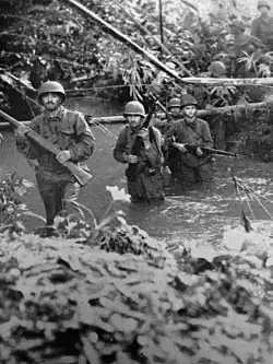 The term "dogface" to describe an American soldier appeared in print at least as early as 1935.[5][6][7] Contemporaneous newspapers accounted for the nickname by explaining that soldiers "wear dog-tags, sleep in pup tents, and are always growling about something" and "the army is a dog's life...and when they want us, they whistle for us."[8][9] Phillip Levesque, a veteran of the U.S. 89th Infantry Division in World War II, wrote that "we were filthy, cold and wet as a duck hunting dog and we were ordered around sternly and loudly like a half-trained dog."[10]