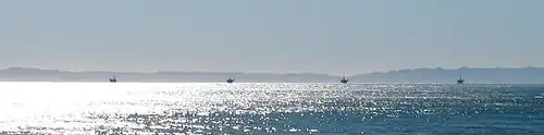 The four platforms producing from the Dos Cuadras Field, as seen from Summerland, California. They are, in order from left to right: Platforms Hillhouse, "A", "B", and "C". Santa Cruz Island in background.