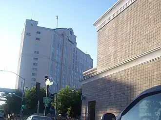 Downtown Modesto featuring the skyline of the DoubleTree Hotel (left; the city's tallest building) and the Brenden Theatres (right) on 9th street.
