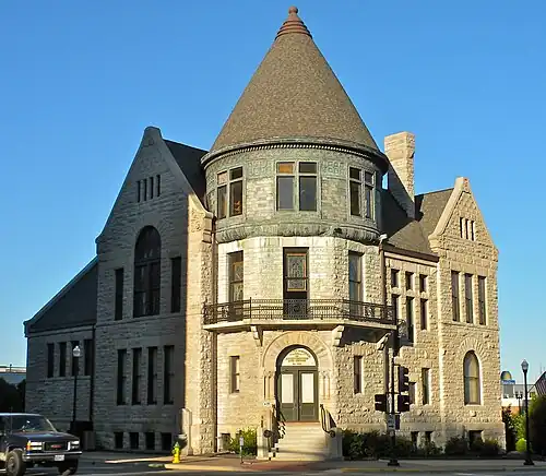 The State Street Savings Loan & Trust Building is an example of Richardsonian Romanesque architecture and was constructed in 1892 by Chicago architects Patton & Fischer. In 1906, an extension was made, designed by local architect Ernest M. Wood. The bank suffered following the Depression and was nearly demolished before being bought by George M. Irwin in 1964. Irwin renovated the structure and converted the lobby to function for retail space. It was added to the National Register of Historic Places in 1979.[25] In January 2000, the structure served as the backdrop to President Bill Clinton's visit to Quincy.[26]