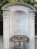 The first fountain, so called, stands upon the side of the road on the west side of the Wissahickon … It is claimed that this is the first drinking fountain erected in the county of Philadelphia outside of the Fairmount Water-Works. A clear, cold, mountain spring is carried by a spout, covered with a lion's head, from a niche in a granite front, with pilasters and pediment into a marble basin. The construction bears the date 1854 … Upon a slab above the niche are cut the words "Pro bono publico"; beneath the basin these, "Esto perpetua".[3]