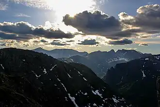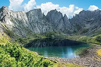 The lower slopes of the range are covered with spruce and larch forests up to altitudes of 1,300 metres (4,300 ft), followed by thickets of dwarf cedar and mountain tundra at higher elevations.[4]